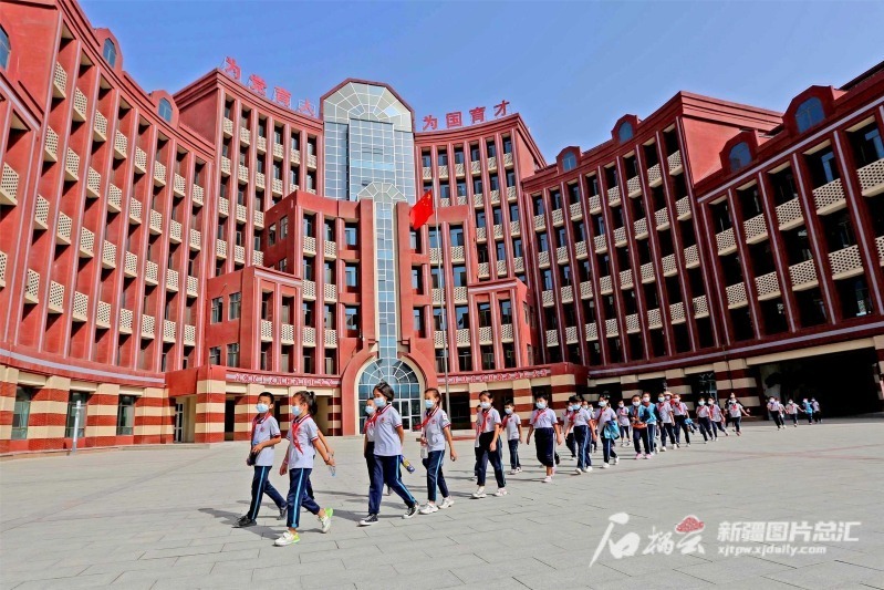 学生从哈密市豫哈实验学校教学楼走出(2021年9月28日摄)。该校2019年投入使用,占地面积约133亩。天山网-新疆日报记者 蔡增乐摄(资料图)