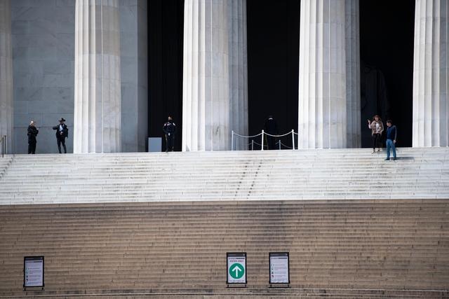 4月16日,在美国首都华盛顿,林肯纪念堂前摆放着新冠疫情提示牌。(新华社记者 刘杰 摄)