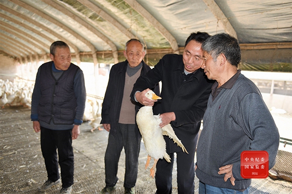 安徽省灵璧县畜牧局下派冯庙镇黄家村第一书记陈培俊在指导农民科学养殖种蛋鸭,他通过多方努力,帮助黄家村成功建起种蛋鸭养殖场,成立公司,解决了30多位村民和贫困户就业问题。(安徽省灵璧县纪委监委供 曹金龙 摄)