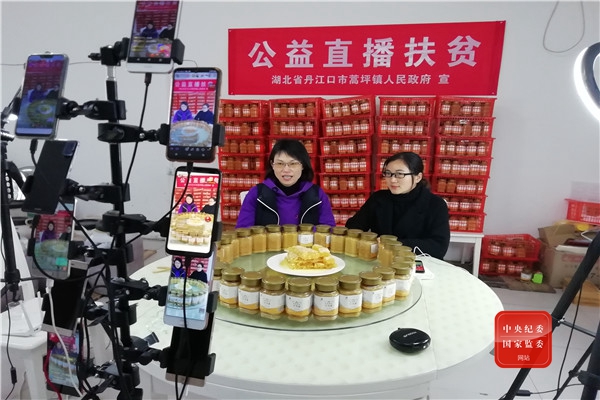 湖北省丹江口市驻黑垭村第一书记谢霞走进网络直播间,通过“试吃”的方式向网民推介黑垭村特色农产品——中华土蜂蜜,助力传统销售方式转型升级,带动贫困蜂农脱贫致富。(湖北省丹江口市纪委监委供 艾照云 摄)