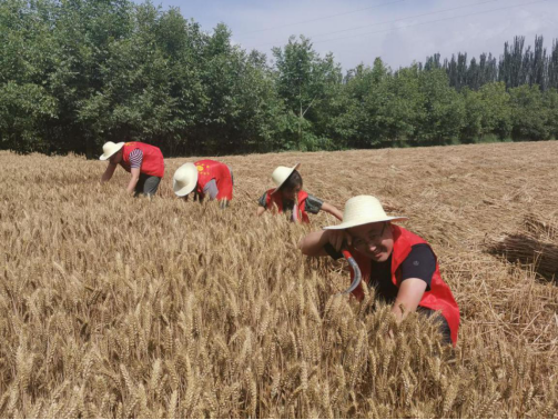 在鲁永章带领下,大家来到村民麦提图尔荪·麦提库尔班家的麦田里,一字排开,弯腰挥镰,割好的麦秸很快堆叠成行。经过两个多小时挥汗如雨的奋战,2.5亩小麦全部收割完毕。