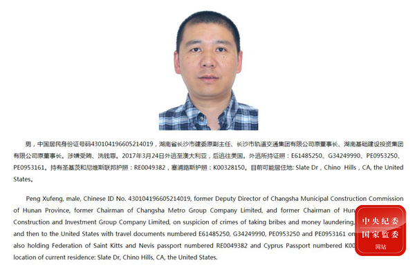 2018年6月,中央反腐败协调小组国际追逃追赃工作办公室发布关于部分外逃人员有关线索的公告。这是彭旭峰的有关线索。