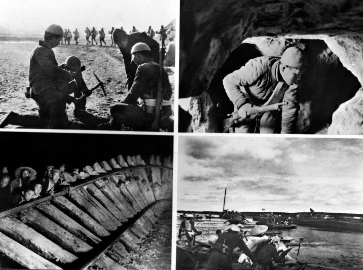 在抗日斗争中,华北平原敌后军民创造了很多有效的歼敌方法,发展了人民战争的战略战术。上图左:地雷战。上图右:地道战。下图左:破袭战。下图右:水上游击战。新华社发