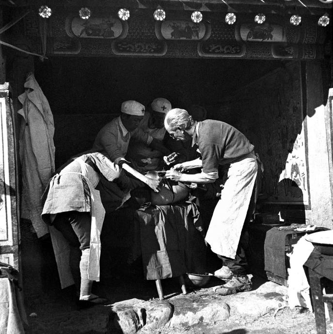 白求恩在晋察冀边区涞源县临时手术室里为伤员做手术。新华社发