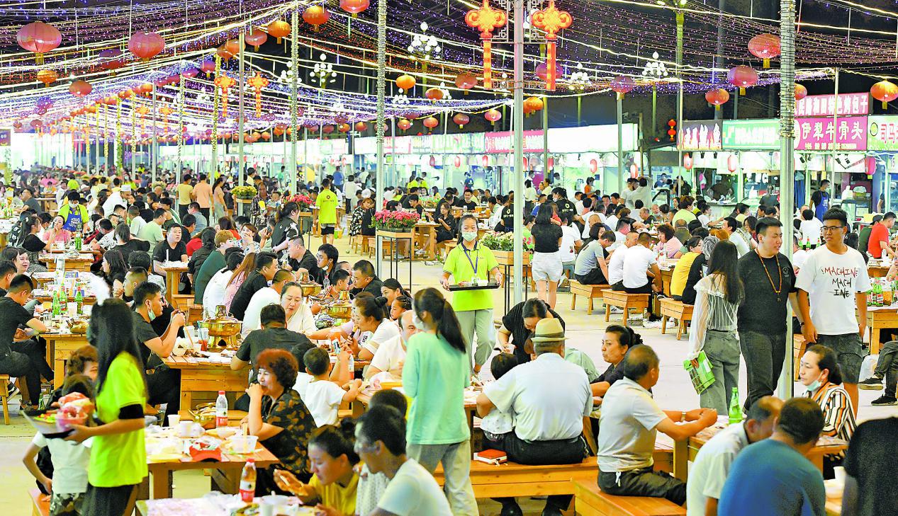 图为2020年夏季的夜晚,市民在新疆哈密市伊州区宝农“七一”夜市品尝美食、聚会聊天。中央统战部供图