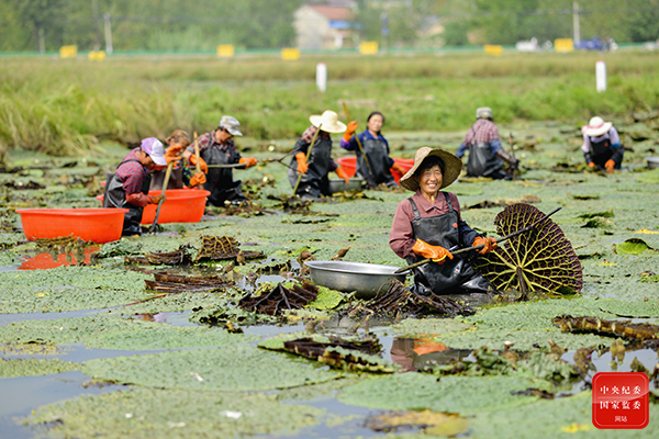 “鸡头果”(学名芡实)采摘的时节,池塘中劳作的人们个个喜笑颜开,安徽省滁州市南谯区通过在脱贫攻坚产业发展中践行“一村一品”思路,形成脱贫产业短板互补、优势互学、资源互享的良好产业发展格局,实现了脱贫产业多元发展。(安徽省滁州市南谯区纪委监委供 杨兰 摄)