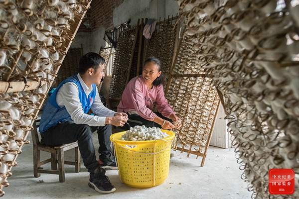 广西壮族自治区蒙山县新圩镇谢村通过大力发展桑蚕产业,带领群众致富,助推贫困户脱贫致富。2020年全村共有80多户群众种桑养蚕,其中建档立卡贫困户7户共种桑33.5亩、每批养蚕30多张,单养蚕产业今年预计每户贫困户增收约8000余元,目前7户贫困户都已脱贫。图为日前,蒙山县新圩镇谢村驻村第一书记张廷杰在建档立卡贫困户李琴家了解养蚕情况。(广西壮族自治区蒙山县纪委监委供 林志清 摄)