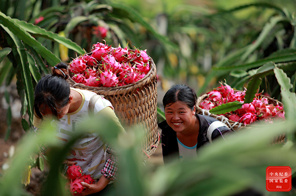 作为贵州省安顺市关岭自治县花江镇特色扶贫产业,红红的火龙果照映着村民幸福的生活,图为农户正在开心地迎接火龙果丰收。(贵州省安顺市关岭自治县纪委监委供 陈志浩 摄)