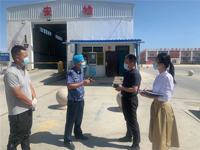 自治区纪委监委疫情防控监督检查组在新疆天顺哈密物流园,对物流园运营流程及各项疫情防控措施落实情况开展监督检查,监督检查组详细了解外地进入车辆和商品的消杀、登记、备案等情况。(王刚 摄)