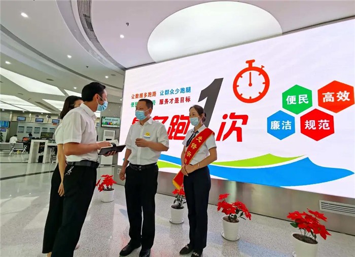 乌鲁木齐市高新区(新市区)纪委监委干部在当地政务服务大厅监督检查优化营商环境政策措施落地情况。(黄玮玲 摄)
