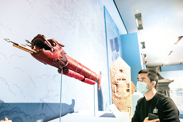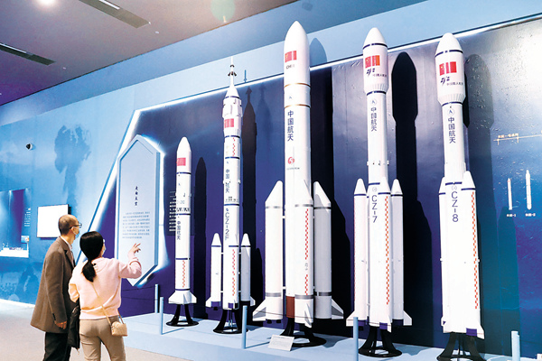 日前,正在中国国家博物馆举行的“科技的力量”展,吸引了不少观众前往参观。上图为观众在国家博物馆观看长征系列运载火箭;下图为观众在国家博物馆观看火龙出水模型,它也被称为世界上最早的二级火箭。(图片来源:视觉中国)