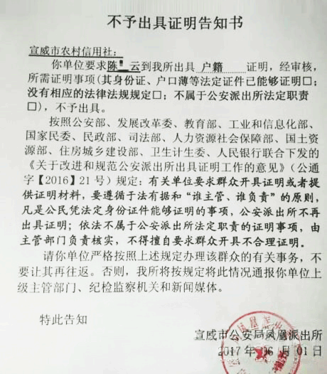 近日,云南宣威一男子持身份证去当地银行办理业务时,被要求开具户籍证明。对此,当地警方“告知书”称,按照相关规定,公安机关已不再出具此类证明,若再让群众往返,将通报银行单位的纪检部门,此回应获网友力挺。