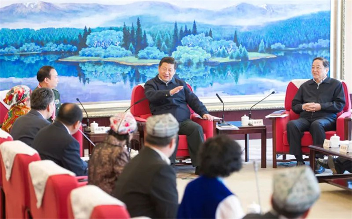 2014年4月27日至30日,习近平总书记在新疆维吾尔自治区视察时强调,紧紧依靠各族干部群众共同团结奋斗,建设团结和谐、繁荣富裕、文明进步、安居乐业的社会主义新疆。图为4月30日,习近平总书记在乌鲁木齐市同劳动模范和先进工作者、先进人物代表座谈。