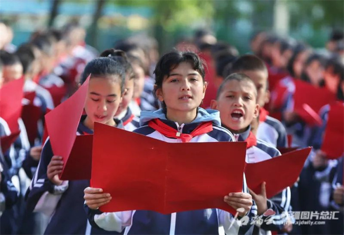 将铸牢中华民族共同体意识纳入国民教育、干部教育、青少年教育和社会教育全过程,在中小学广泛开展中华经典诵读工程。图为2018年5月,新疆维吾尔自治区博乐市第八中学学生朗诵《少年中国说》。