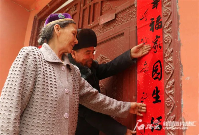 坚持以凝聚人心为根本,深入开展“文化润疆”工作。图为2022年1月,新疆维吾尔自治区疏勒县英阿瓦提乡滚独鲁库木村村民在家门口贴春联,喜迎新春佳节。